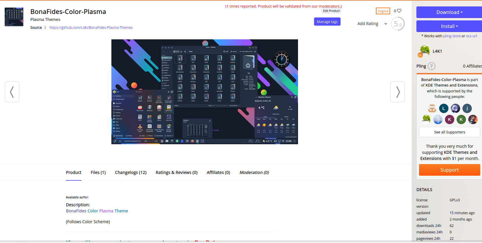 A few minutes ago I updated the Plasma Theme “BonaFides-Color-Plasma” and it was not “Reported” before the update. However, immediately after the update: